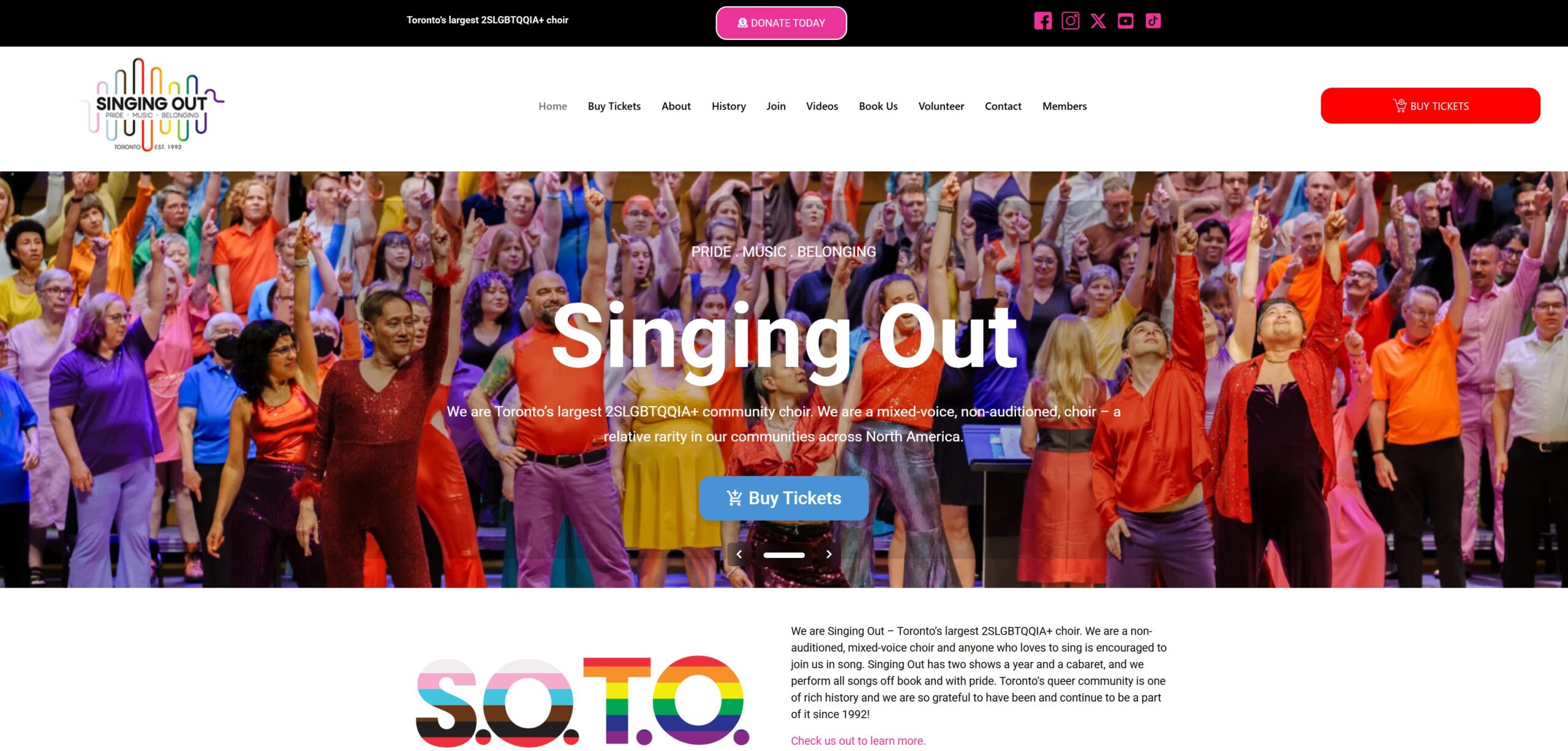 We are Singing Out โ Torontoโs largest 2SLGBTQQIA+ choir. We are a non-auditioned, mixed-voice choir and anyone who loves to sing is encouraged to join us in song.